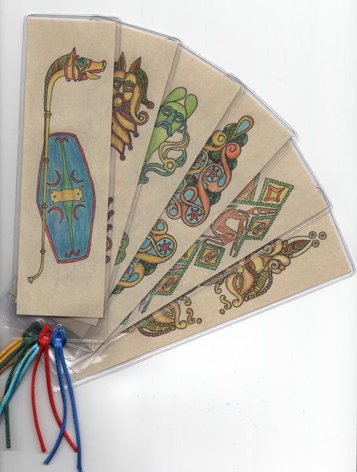 Lesezeichen mit keltischen Flechtmustern: auf Rohhaut-Imitat aus festem Papier gedruckt, mit Bunt- oder Filzstiften bemalbar, in Schutzhülle mit Sc...
