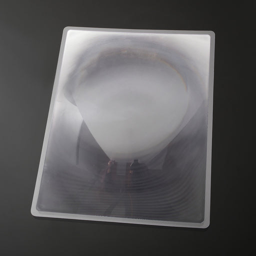 Fresnel-Blattlupe aus Kunststofffolie (60×60 mm, 0,43 mm), Brennweite 195 mm, ca. 1,3-fache Vergrößerung, Rillenabstand 0,5 mm.