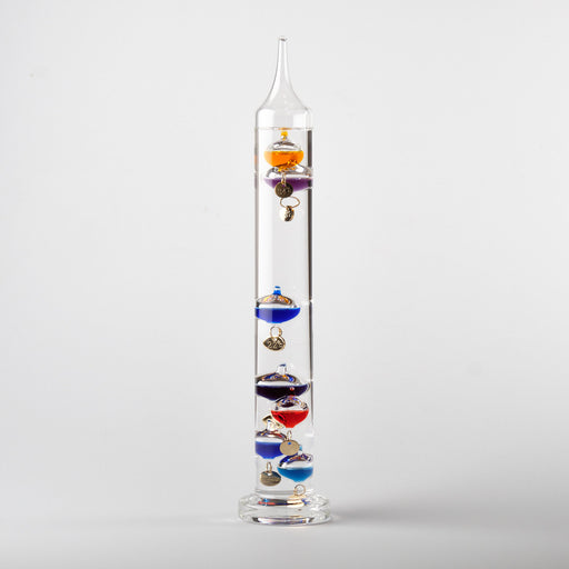 7 farbig gefüllte Glaskugeln im Glaskolben mit goldenen Gradschildern, Flüssigkeit Petroleum/Alkohol: Messbereich 18–24°C, Genauigkeit 1°C, 30 cm h...